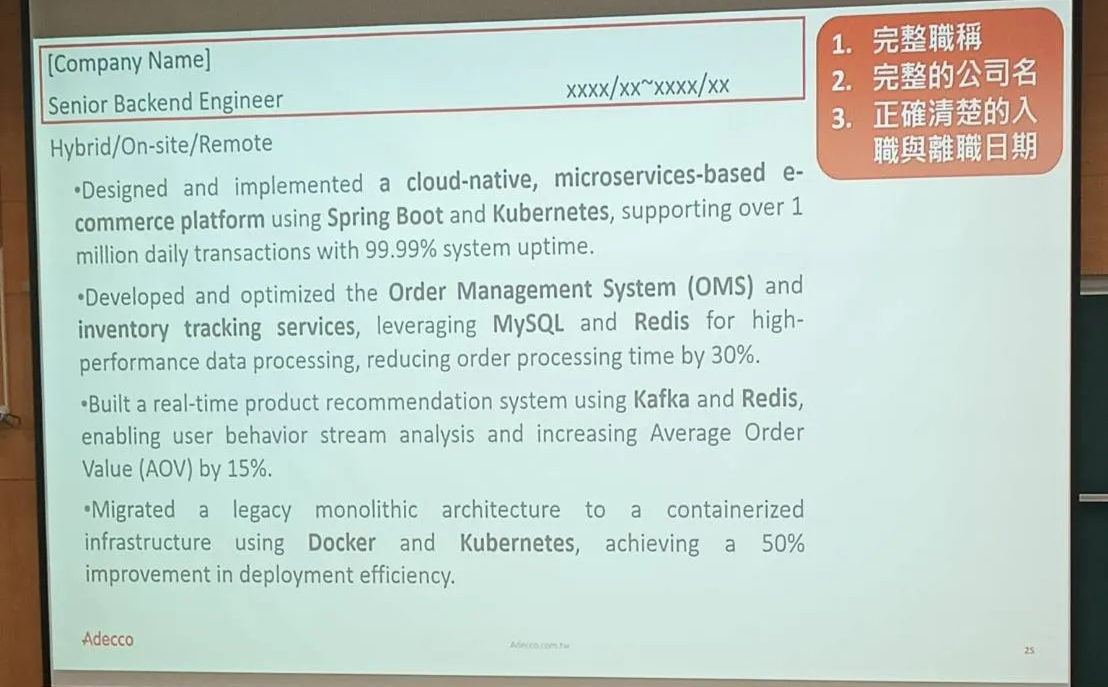 - Skill 技能,如果有經驗的技能,盡量放在技能欄位,好讓自己被發現。(A社獵頭表示軟體工程師不必寫軟實力)